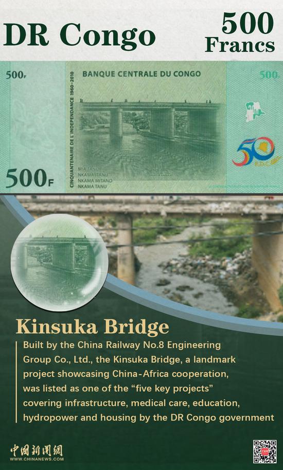 Besides, the Kinsuka Bridge, built by the China Railway No. 8 Engineering Group Co., Ltd., is featured on the Congo Democratic Republic 500 Franc commemorative banknote. As a landmark project showcasing China-Africa cooperation, it was listed as one of the “five key projects” covering infrastructure, medical care, education, hydropower and housing by the DR Congo government.