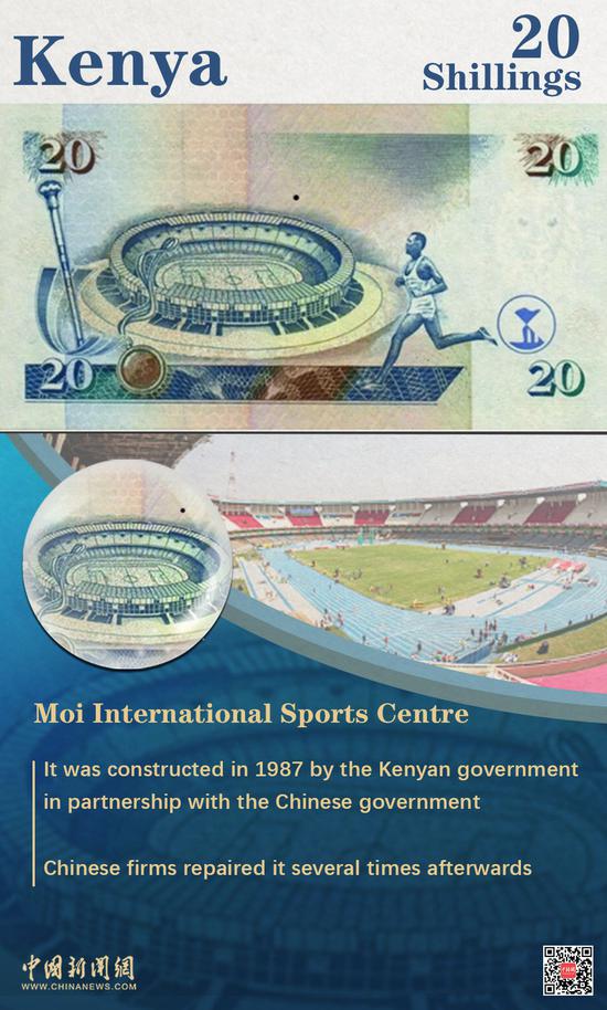 The Moi International Sports Centre in the 20 Kenyan shillings is a testimony to the friendship between China and Kenya. Constructed in 1987 by the Kenyan government in partnership with the Chinese government, it is one of the largest and best stadiums in Africa. The Chinese side repaired it several times afterward.