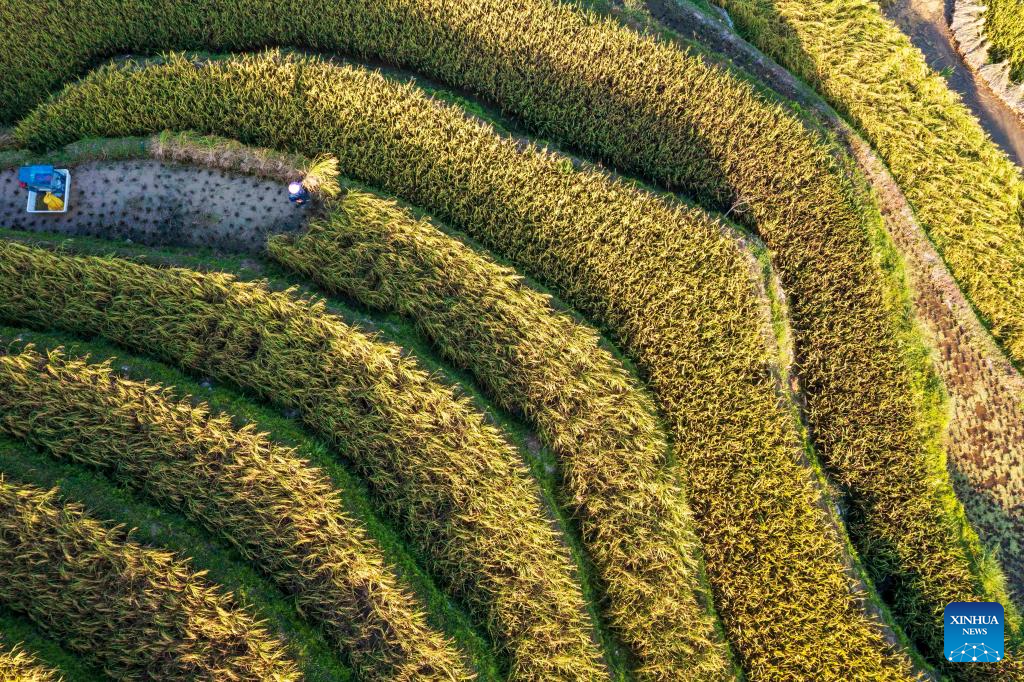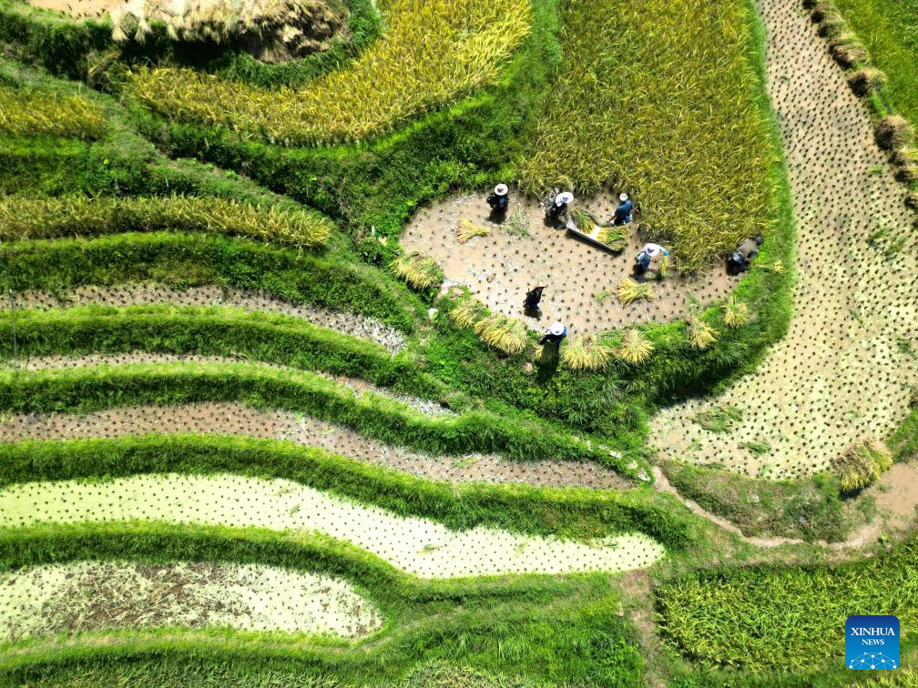 An aerial drone photo taken on Sept. 4, 2024 shows farmers harvesting paddy in terraced fields in Congjiang County, Qiandongnan Miao and Dong Autonomous Prefecture, southwest China's Guizhou Province. (Xinhua/Yang Wenbin)