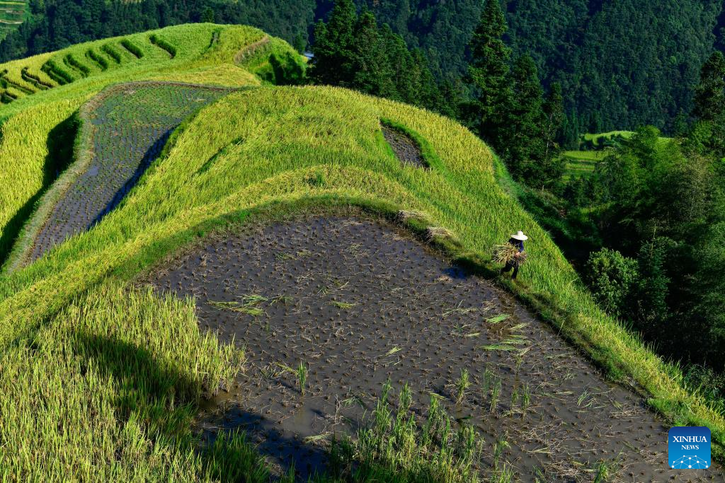 An aerial drone photo taken on Sept. 4, 2024 shows a farmer harvesting paddy in terraced fields in Congjiang County, Qiandongnan Miao and Dong Autonomous Prefecture, southwest China's Guizhou Province. (Photo by Wu Dejun/Xinhua)