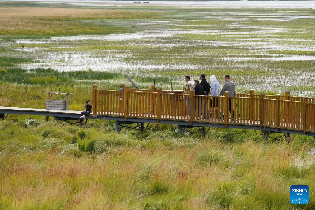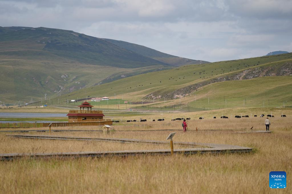 Tourists view the scenery of Gahai Lake wetland in the Gahai-Zecha National Nature Reserve in Gannan Tibetan Autonomous Prefecture, northwest China's Gansu Province, Sept. 4, 2024. (Xinhua/Xu Bingjie)