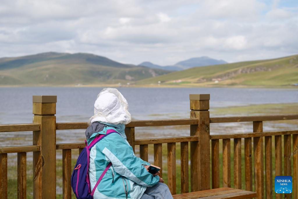 A tourist views the scenery of Gahai Lake wetland in the Gahai-Zecha National Nature Reserve in Gannan Tibetan Autonomous Prefecture, northwest China's Gansu Province, Sept. 4, 2024. (Xinhua/Xu Bingjie)