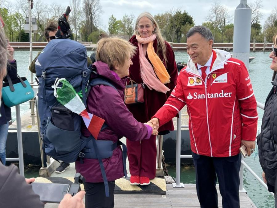 Vienna Cammarota departs from Lazzaretto Nuovo Island in Venice as Zhu Yuhua, president of Associazione Cina-Italia di Shanghai (ACIS) bids her farewell, April 26, 2022. (Photo provided by Associazione Cina-Italia di Shanghai)