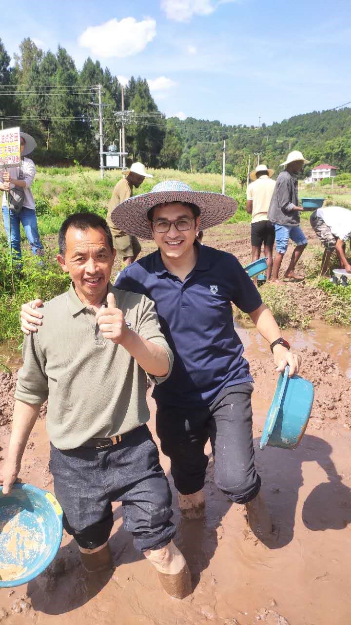Niraj Lawoju (center right) poses with a Chinese farmer in a paddy field, Sichuan province, April 19, 2024. Lawoju had joined other international students from Sichuan University in a cultural learning event at a local village for Grain Rain, the sixth of the 24 solar terms of the Chinese lunar calendar that marks the end of spring. During the event, local farmers taught the students how to prepare seeds for sowing. (Photo provided by Niraj Lawoju)