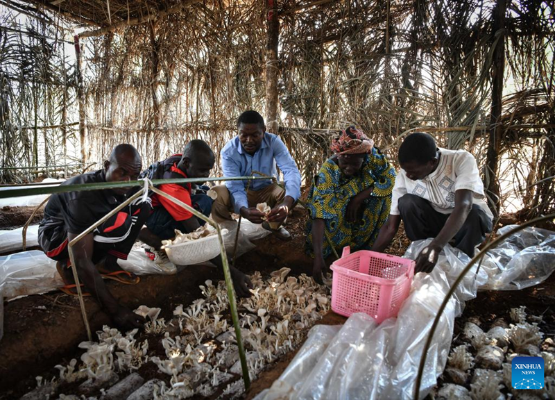 Pierrette Wamoundjou, second from right, picks mushrooms with villagers in Gba village near Bangui, Central African Republic, Feb. 5, 2024. (Xinhua/Han Xu)
