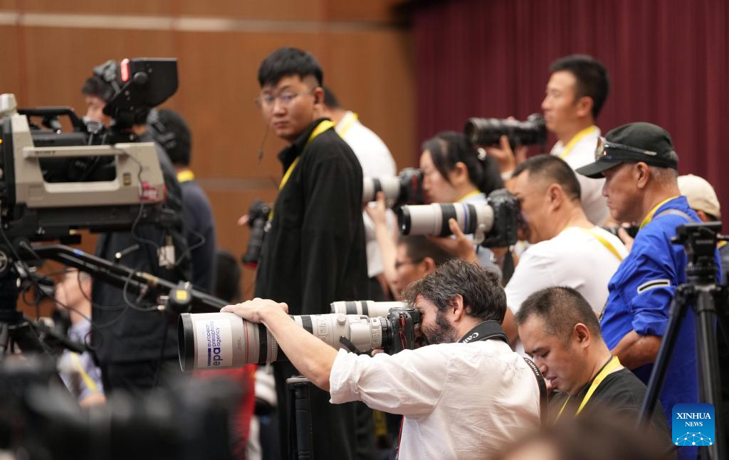 Journalists work at a press meeting attended by Chinese Foreign Minister Wang Yi, also a member of the Political Bureau of the Communist Party of China Central Committee, together with Senegalese Foreign Minister Yacine Fall and Minister of Foreign Affairs of the Republic of the Congo Jean-Claude Gakosso in Beijing, capital of China, Sept. 5, 2024. (Xinhua/Pang Xinglei)