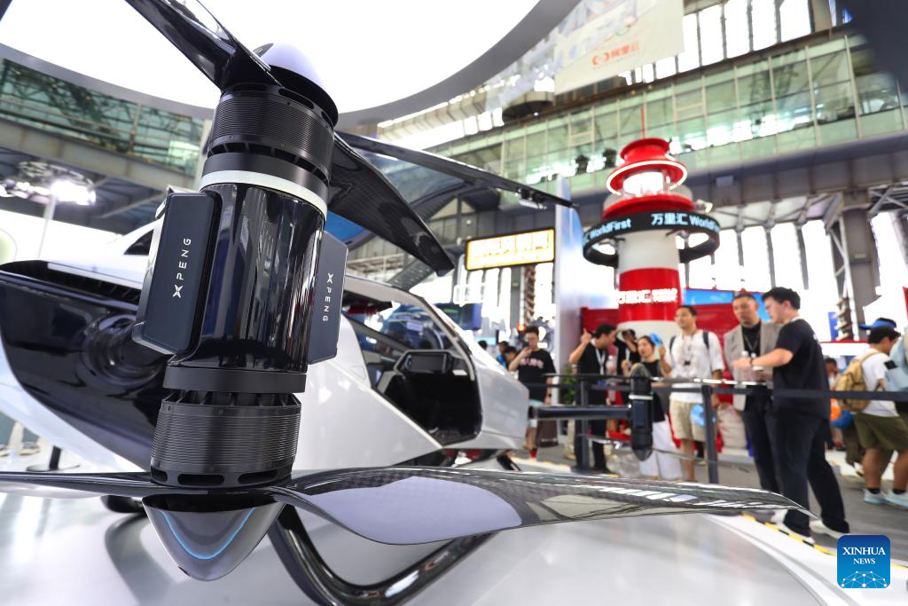 People watch Xpeng's flying car X2 displayed at an exhibition during the 2024 Inclusion Conference on the Bund in Shanghai, east China, Sept. 5, 2024. With the theme Technology for a Sustainable Future, the conference kicked off here on Thursday. (Xinhua/Fang Zhe)