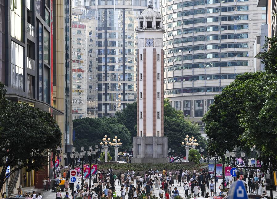Tourists visit Jiefangbei, a business area in southwest China's Chongqing, Aug. 21, 2024. (Xinhua/Wang Quanchao)