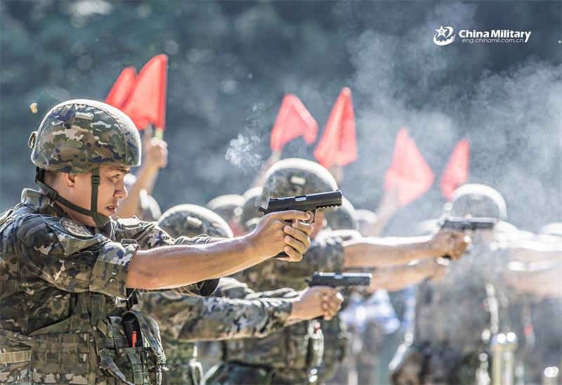 Soldiers assigned to a mobile detachment under the Chinese People's Armed Police (PAP) Force Guangxi Corps take part in military skills competition aiming to examine the troops' phased training results on August 14, 2024. (eng.chinamil.com.cn/Photo by He Jialong)