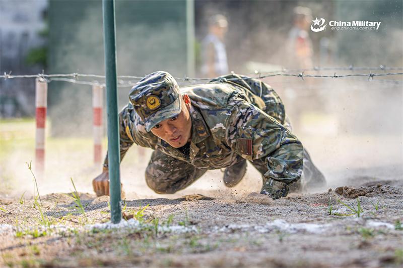 A soldier assigned to a mobile detachment under the Chinese People's Armed Police (PAP) Force Guangxi Corps takes part in military skills competition aiming to examine the troops' phased training results on August 14, 2024. (eng.chinamil.com.cn/Photo by He Jialong)