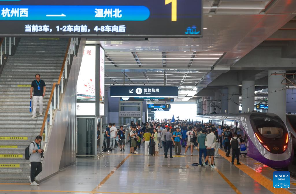 The bullet train No. G9505 arrives at Wenzhoubei Railway Station of the Hangzhou-Wenzhou high-speed railway in Wenzhou, east China's Zhejiang Province, Sept. 6, 2024.