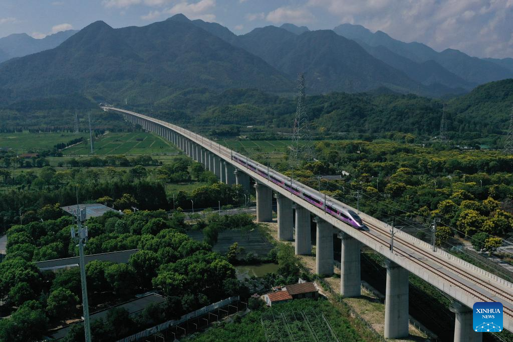 A new high-speed railway linking Hangzhou and Wenzhou in east China's Zhejiang Province began operations on Friday. The 276-km line, with a designed speed of 350 km per hour, has nine stations. Its operation offers a rapid transit solution along the route threading the economic hubs of Hangzhou, Yiwu and Wenzhou in one of the country's most economically vibrant regions. (Xinhua/Jiang Han)