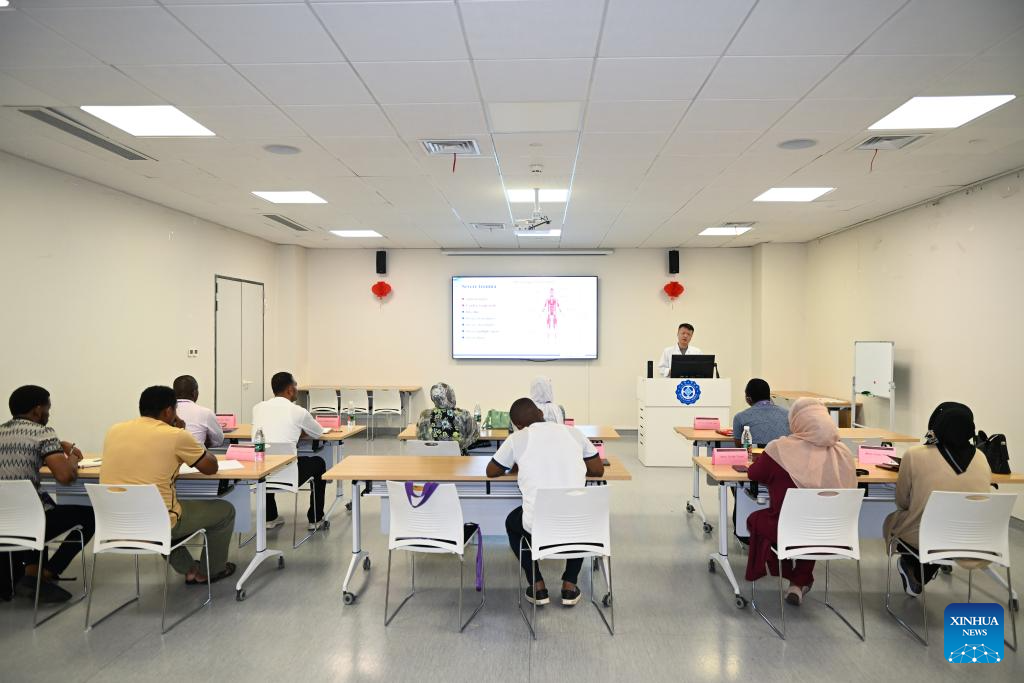 Foreign trainees under the Belt and Road Training Program for Healthcare Excellence attend a lesson at Jiangsu Province Hospital in Nanjing, capital of east China's Jiangsu Province, Sept. 4, 2024. The training program, lasting from Sept. 1 to 15, is attended by 45 trainees from 15 Belt and Road Initiative (BRI) partner countries with a main focus on first aid and digestive endoscopy. (Xinhua/Ji Chunpeng)