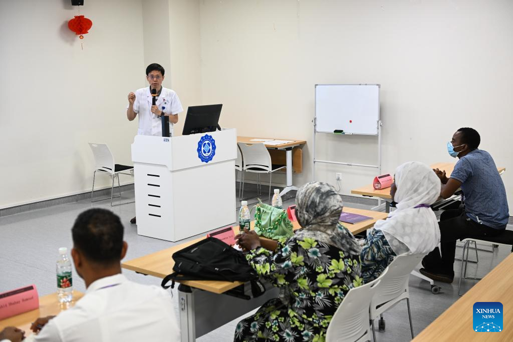 A Chinese doctor gives a lecture for foreign trainees under the Belt and Road Training Program for Healthcare Excellence at Jiangsu Province Hospital in Nanjing, capital of east China's Jiangsu Province, Sept. 4, 2024. The training program, lasting from Sept. 1 to 15, is attended by 45 trainees from 15 Belt and Road Initiative (BRI) partner countries with a main focus on first aid and digestive endoscopy. (Xinhua/Ji Chunpeng)