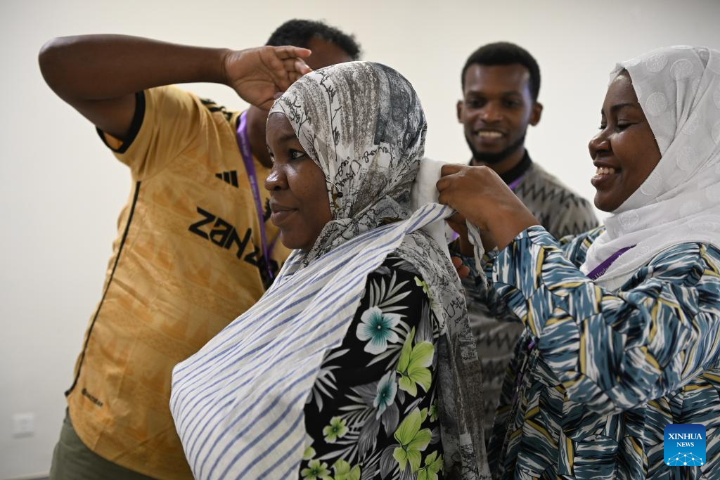 A Chinese doctor (C) teaches bandage-fixing therapy to foreign trainees under the Belt and Road Training Program for Healthcare Excellence at Jiangsu Province Hospital in Nanjing, capital of east China's Jiangsu Province, Sept. 4, 2024. The training program, lasting from Sept. 1 to 15, is attended by 45 trainees from 15 Belt and Road Initiative (BRI) partner countries with a main focus on first aid and digestive endoscopy. (Xinhua/Ji Chunpeng)