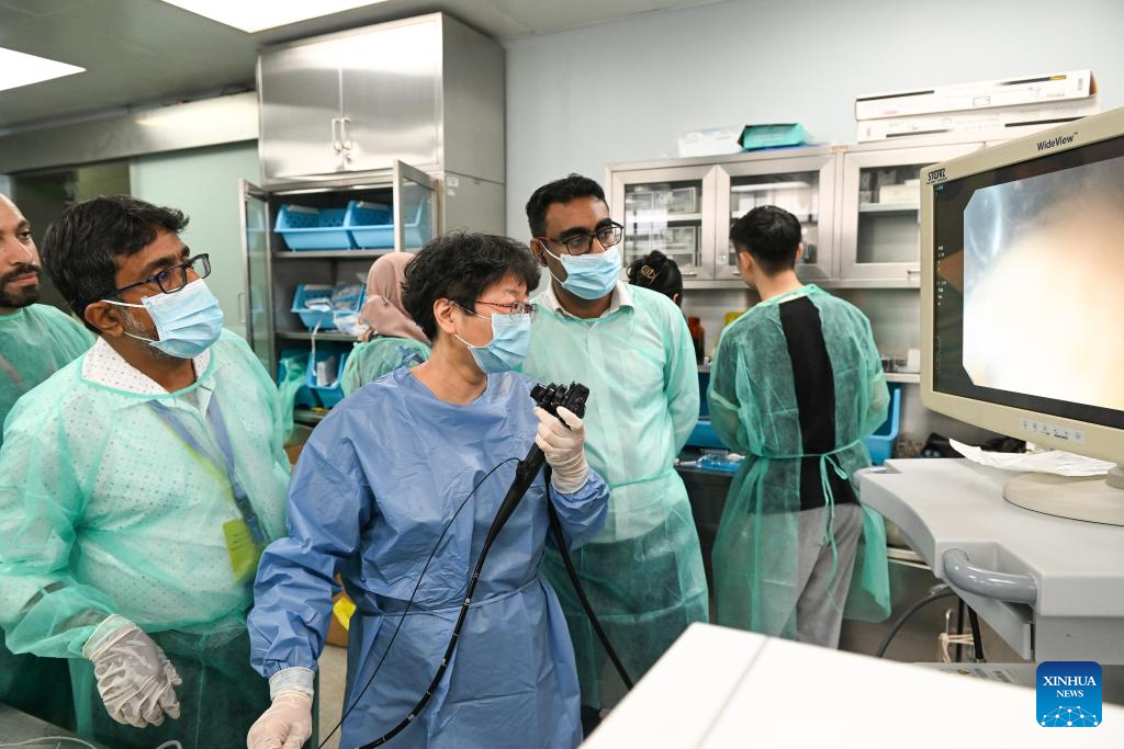 A Chinese doctor teaches foreign trainees under the Belt and Road Training Program for Healthcare Excellence to use endoscope at Jiangsu Province Hospital in Nanjing, capital of east China's Jiangsu Province, Sept. 4, 2024. The training program, lasting from Sept. 1 to 15, is attended by 45 trainees from 15 Belt and Road Initiative (BRI) partner countries with a main focus on first aid and digestive endoscopy. (Xinhua/Ji Chunpeng)