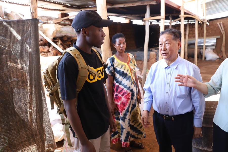 Professor Lin Zhanxi (R, front), the inventor of Juncao Technology, talks with Alphonse Munyaneza (L, front), a Rwandan university student growing mushrooms, in Kigali, Rwanda, Aug. 3, 2024. (Photo by Huang Wanqing/Xinhua)