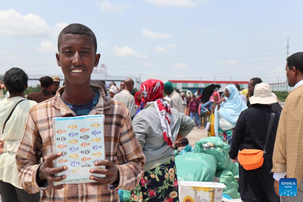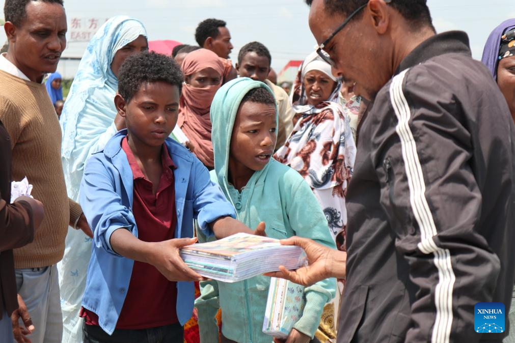 A boy receives donated notebooks at the Eastern Industry Zone in Dukem town, Ethiopia, on Sept. 6, 2024. The Eastern Industry Zone Investors Association on Friday extended a helping hand to the needy people living in and around Dukem town, about 35 kilometers east of the Ethiopian capital, Addis Ababa. (Xinhua/Liu Fangqiang)