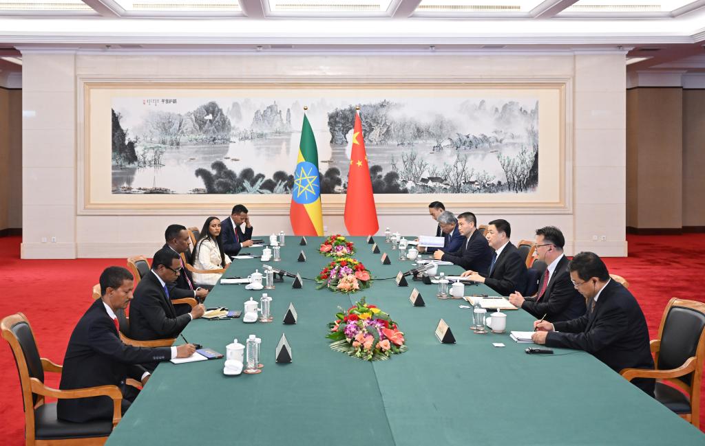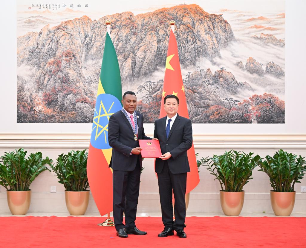 Wang presented Gebremichael with the Great Wall Commemorative Medal, saying that China is willing to work with Ethiopia to implement the spirit of the 2024 Summit of the Forum on China-Africa Cooperation (FOCAC), deepen practical cooperation in areas such as the security of the Belt and Road Initiative, and law-enforcement capacity building.