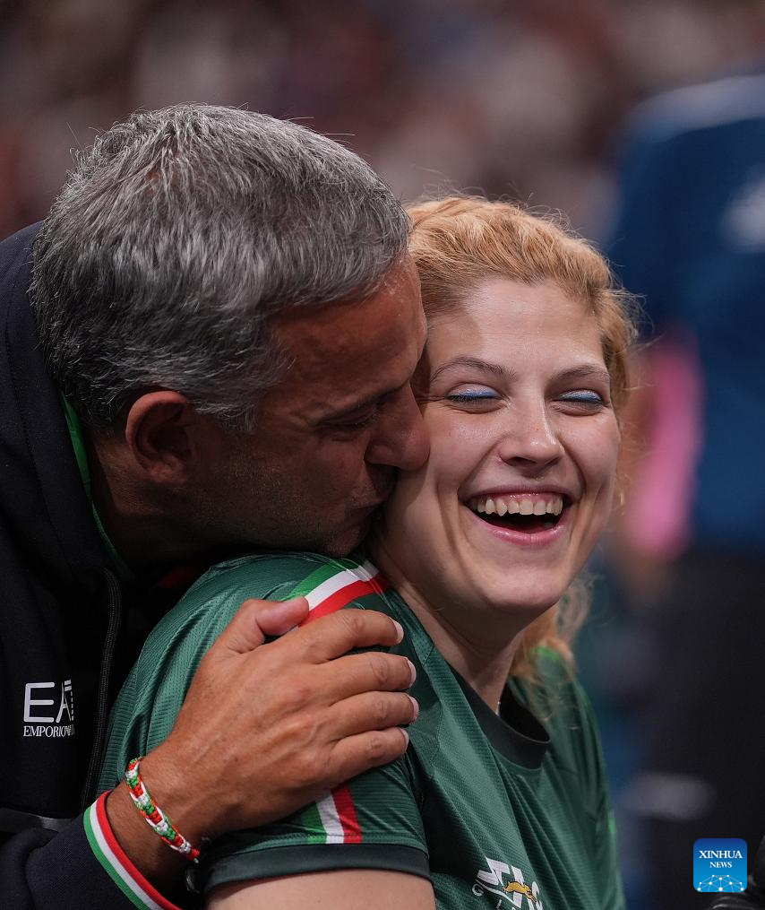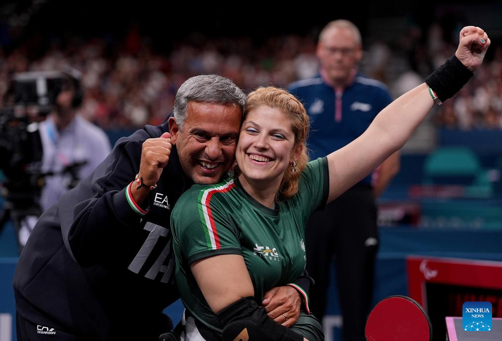 Giada Rossi (R) of Italy celebrates after winning the Para Table Tennis women's singles WS1-2 final match against Liu Jing of China at the Paris 2024 Paralympic Games in Paris, France, Sept. 6, 2024. (Xinhua/Hou Zhaokang)