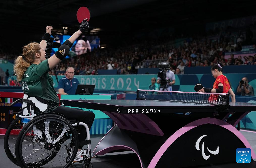 Giada Rossi (L) of Italy celebrates after winning the Para Table Tennis women's singles WS1-2 final match against Liu Jing of China at the Paris 2024 Paralympic Games in Paris, France, Sept. 6, 2024. (Xinhua/Hou Zhaokang)