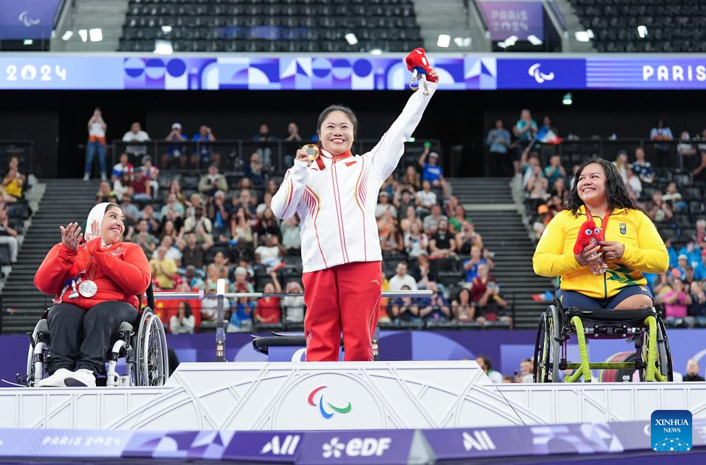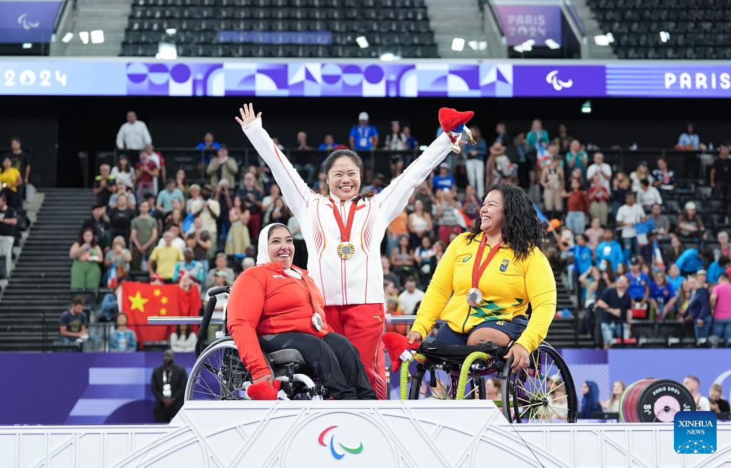 Gold medalist Tan Yujiao (C) of China, silver medalist Fatma Elyan (L) of Egypt and bronze medalist Maria de Fatima Costa De Castro of Brazil pose during the awarding ceremony for the para powerlifting women's up to 67kg event at the Paris 2024 Paralympic Games in Paris, France, Sept. 6, 2024. (Xinhua/Lian Yi)