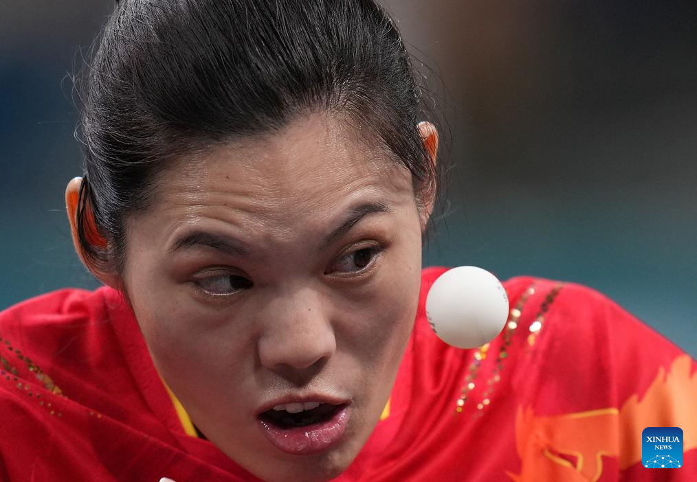 Liu Jing of China competes during the Para Table Tennis women's singles WS1-2 final match against Giada Rossi of Italy at the Paris 2024 Paralympic Games in Paris, France, Sept. 6, 2024. (Xinhua/Hou Zhaokang)