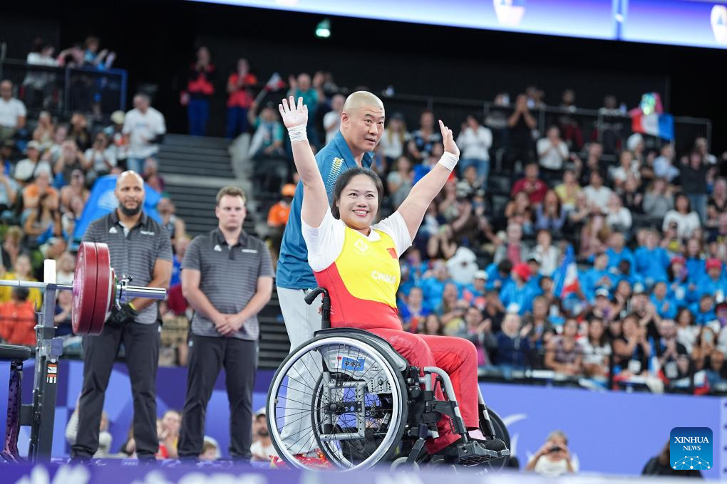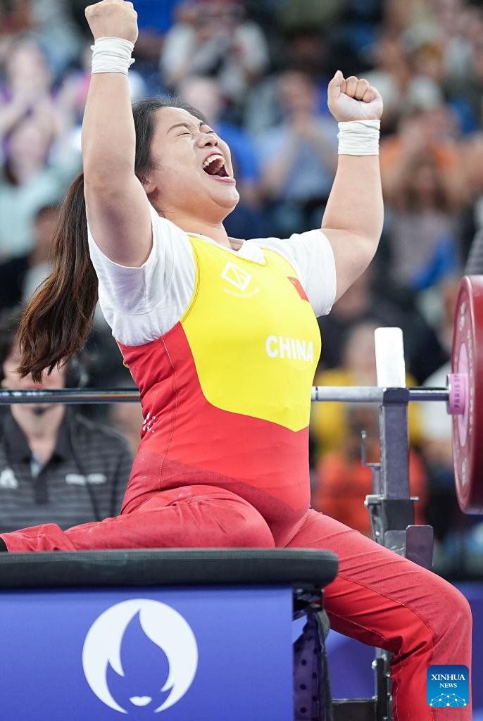 Tan Yujiao of China celebrates after the para powerlifting women's up to 67kg final at the Paris 2024 Paralympic Games in Paris, France, Sept. 6, 2024. (Xinhua/Lian Yi)