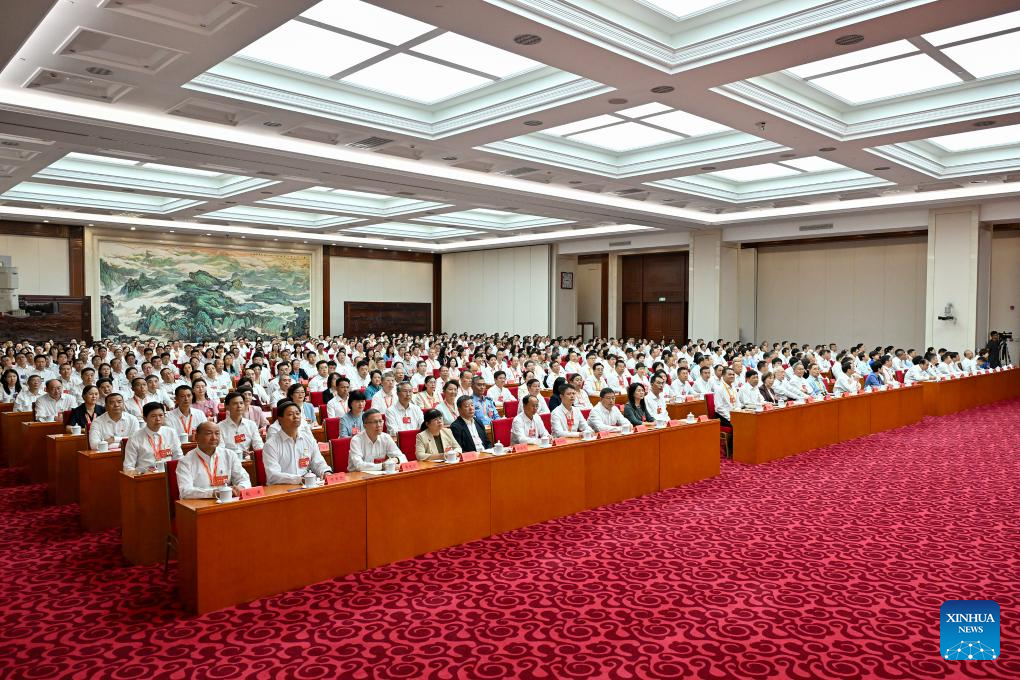 Participants listen to a representative's speech at an awarding ceremony to honor model teachers and outstanding groups and institutions in China's education sector in Beijing, capital of China, Sept. 8, 2024. The awarding ceremony was held on Sunday in Beijing ahead of Teachers' Day, which falls on Sept. 10. This year's Teachers' Day is the 40th of its kind in China. (Xinhua/Li Xin)