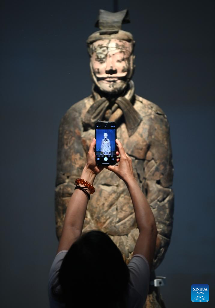 A visitor takes photos at an exhibition commemorating the 50th anniversary of the discovery and excavation of the iconic Terracotta Warriors, at the Emperor Qinshihuang's Mausoleum Site Museum in Xi'an, capital of northwest China's Shaanxi Province, Sept. 8, 2024. The exhibition, which opened on Sunday, showcases 230 cultural relics in eight categories, many being revealed to the public for the first time, offering a glimpse into the era of Emperor Qinshihuang of the Qin Dynasty (221 BC-207 BC). (Xinhua/Li Yibo)