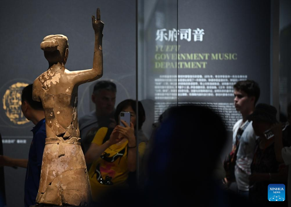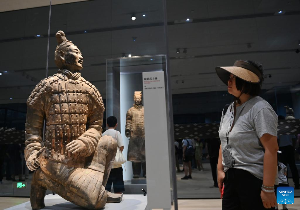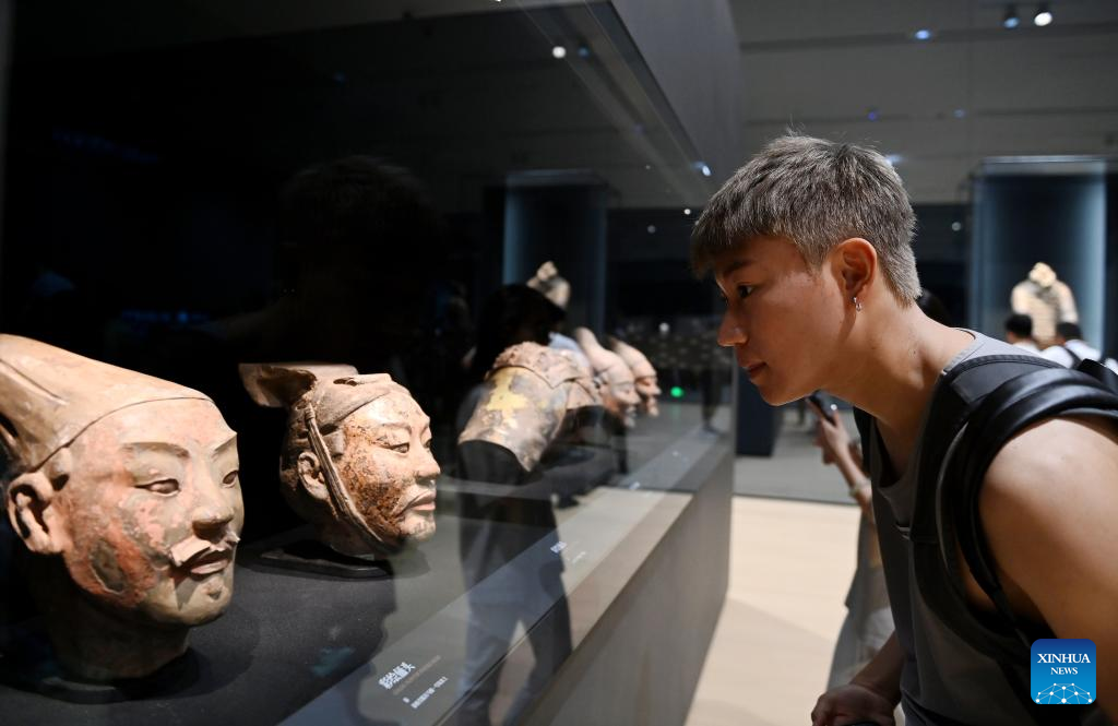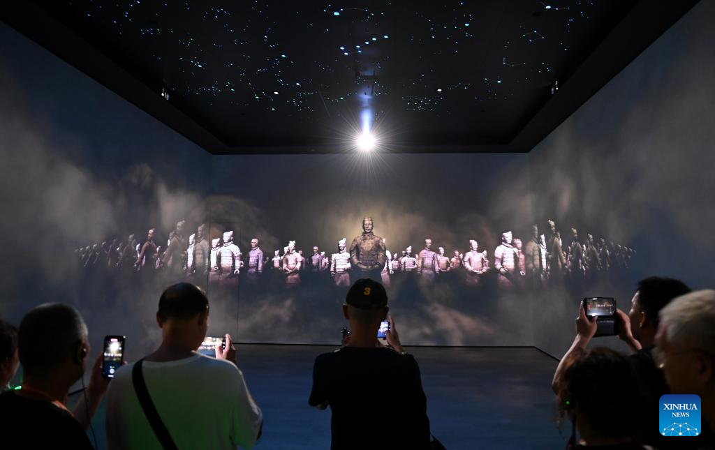 People visit an exhibition, commemorating the 50th anniversary of the discovery and excavation of the iconic Terracotta Warriors, at the Emperor Qinshihuang's Mausoleum Site Museum in Xi'an, capital of northwest China's Shaanxi Province, Sept. 8, 2024. The exhibition, which opened on Sunday, showcases 230 cultural relics in eight categories, many being revealed to the public for the first time, offering a glimpse into the era of Emperor Qinshihuang of the Qin Dynasty (221 BC-207 BC). (Xinhua/Li Yibo)