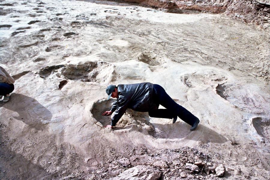 File photo taken in March of 2001 shows a geologist "measuring" the length of a footprint of dinosaur with himself in Yongjing County of northwest China's Gansu Province. Yongjing County, where a huge number of dinosaur fossils have been found and unearthed since the late 1990s, was awarded the title of "China Hometown of Dinosaurs" . (Xinhua/Shi Youdong)
