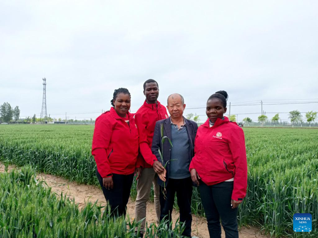 Francina Lerato Kuwali (1st L), an international student from Malawi at China Agricultural University (CAU), and her classmates pose for a group photo with a farmer at an experimental field in Quzhou, north China's Hebei Province, May 10, 2024. (Xinhua)