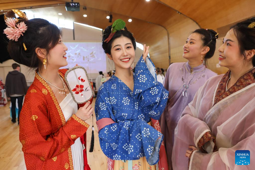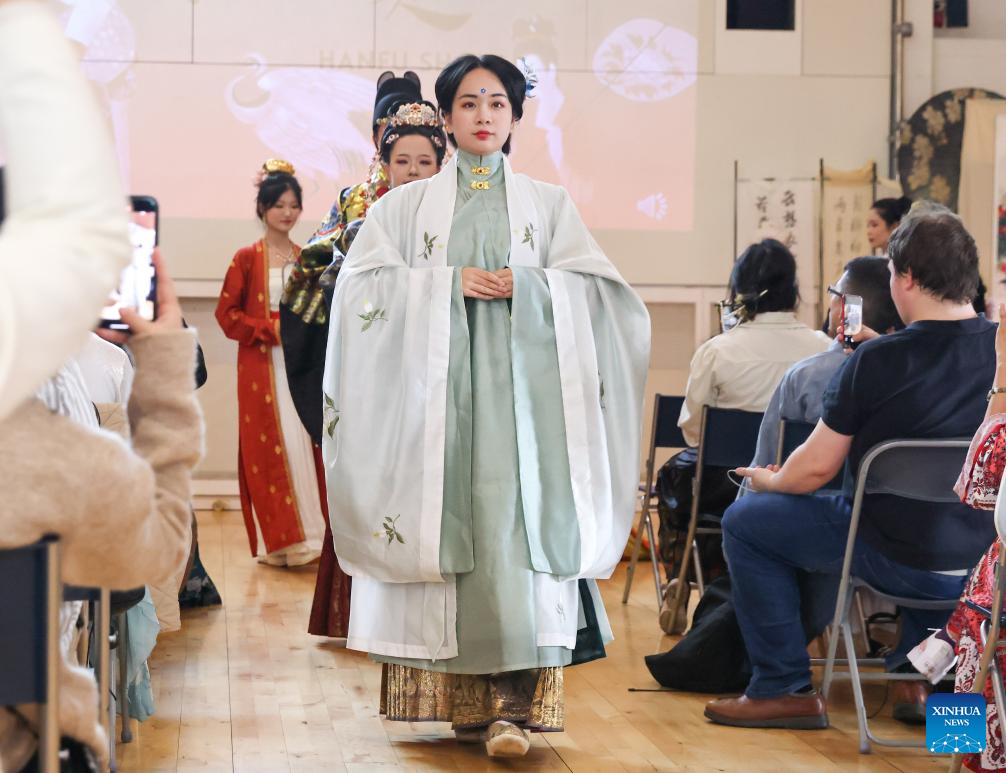 Hanfu enthusiasts attend a Hanfu display event held to celebrate the upcoming Mid-Autumn Festival in London, Britain, Sept. 8, 2024. (Xinhua)