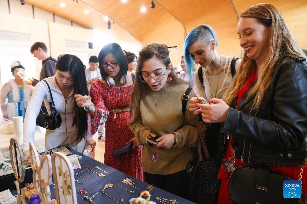 People visit market stalls during a Hanfu display event held to celebrate the upcoming Mid-Autumn Festival in London, Britain, Sept. 8, 2024. (Xinhua)