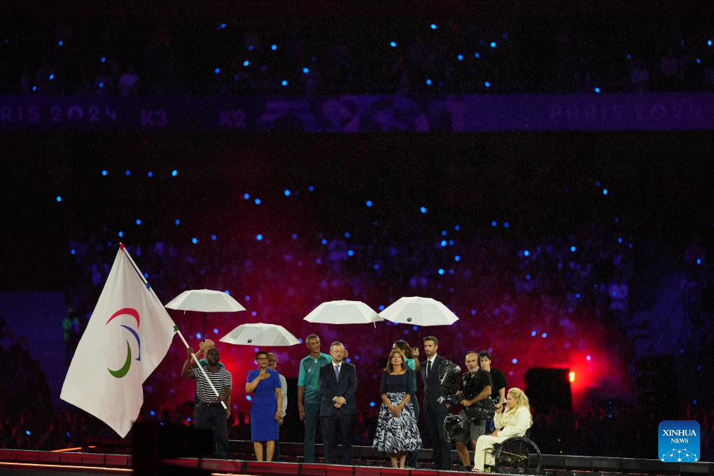 The Paralympic flag is seen during the closing ceremony of the Paris 2024 Paralympic Games in Paris, France, Sept. 8, 2024. (Xinhua/Huang Wei)