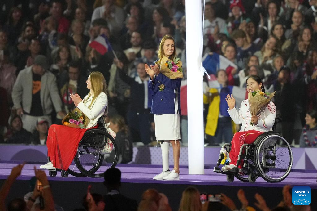 China's para-powerlifter Tan Yujiao (R), member of the International Paralympic Committee (IPC) Athletes' Council, reacts during the closing ceremony of the Paris 2024 Paralympic Games in Paris, France, Sept. 8, 2024. (Xinhua/Huang Wei)