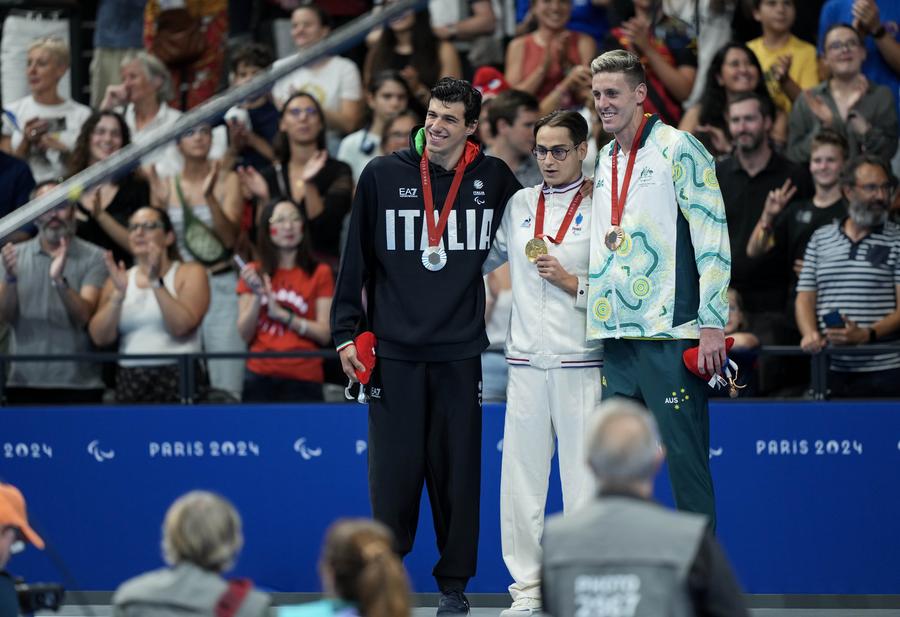 Gold medalist Ugo Didier of France (C), silver medalist Simone Barlaam (L) of Italy and bronze medalist Brenden Hall of Australia pose for a group photo during the awarding ceremony of the men's 400m Freestyle S9 final of swimming event at the Paris 2024 Paralympic Games in Paris, France, Aug. 29, 2024. (Xinhua/Zhang Haofu)