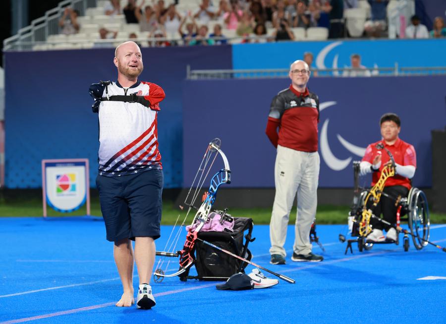 Matt Stutzman (L) of the United States greets the audience before the para archery men's individual compound open gold medal match at the Paris 2024 Paralympic Games in Paris, France, Sept. 1, 2024. (Xinhua/Hou Jun)