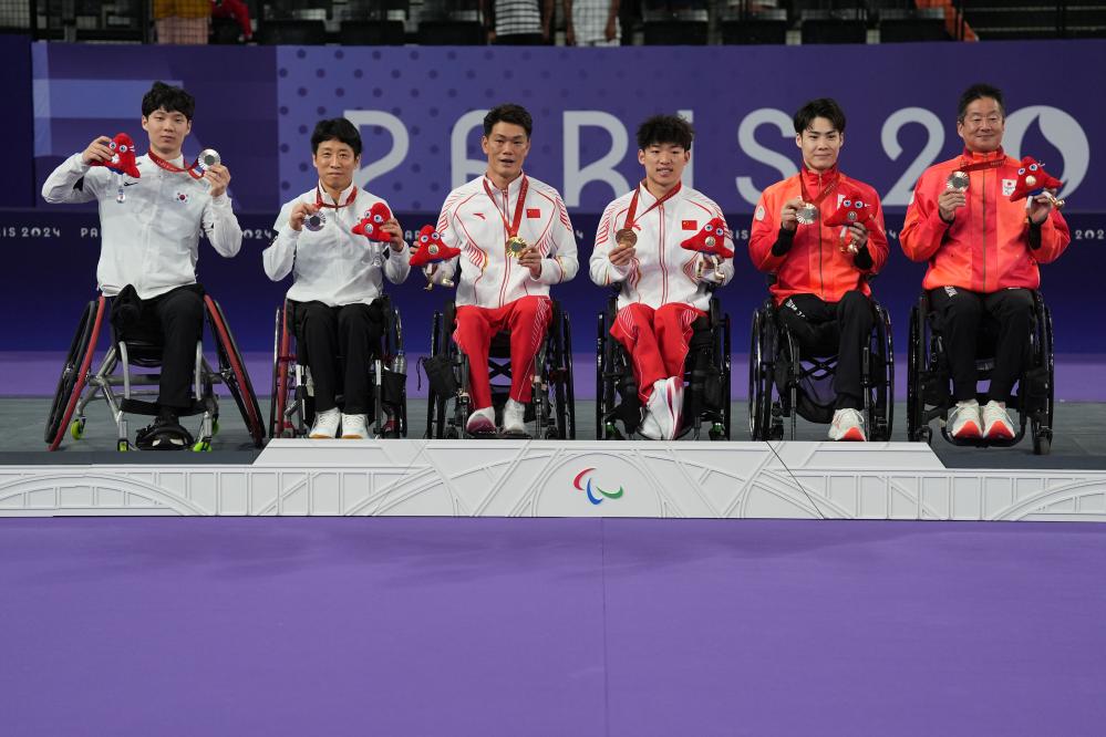 Hiroshi Murayama (right) at the medal ceremony for the badminton men's doubles WH1-WH2 category at the Paris 2024 Paralympic Games in Paris, France, Sept. 3, 2024. (Xinhua/Xing Guangli)