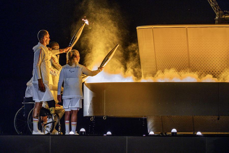 Torch bearers light up the Paralympic cauldron during the opening ceremony of the Paris 2024 Paralympic Games in Paris, France, Aug. 28, 2024. (Xinhua/Huang Wei)