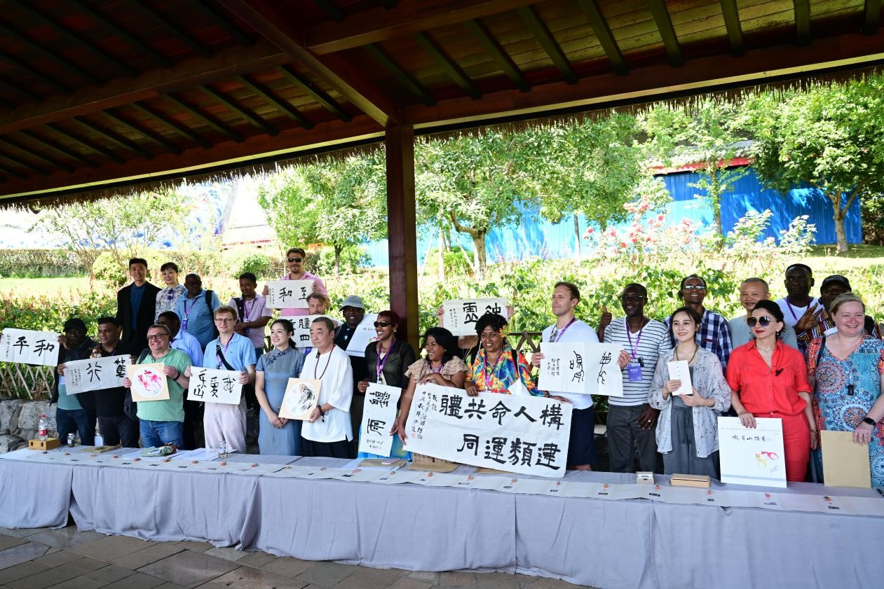 Media representatives participating in the 2024 Media Cooperation Forum on Belt and Road and artists from Emeishan city show artworks co-created by them. (Photo/Chen Chun'an)