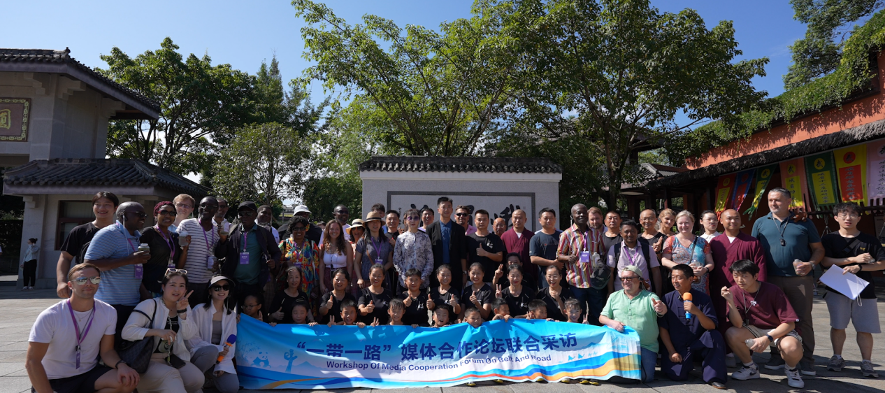 Media representatives participating in the 2024 Media Cooperation Forum on Belt and Road pose for a picture with martial arts trainers and trainees from the Emei Kung-Fu Alliance. (Photo/Chen Chun'an)
