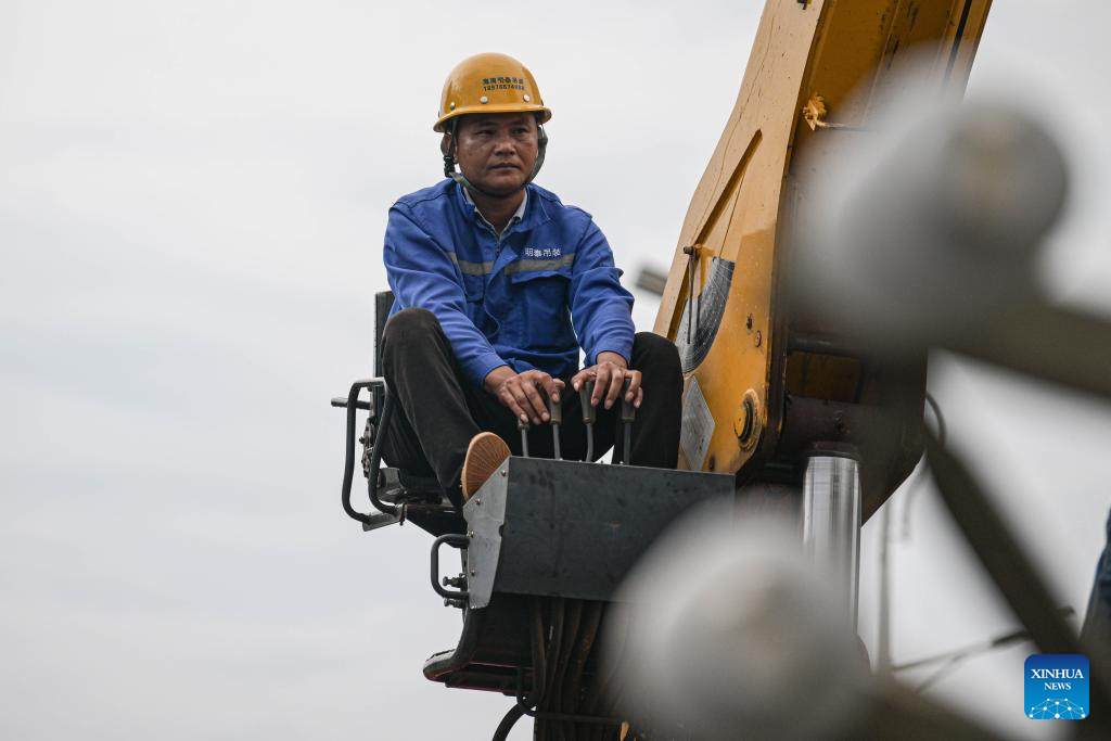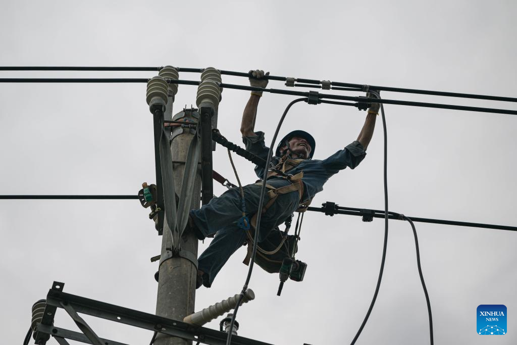 A staff member repairs electrical facilities in Chengmai County, south China's Hainan Province, Sept. 9, 2024. Emergency response workers are busy fixing power supply facilities in Chengmai after Super Typhoon Yagi, the strongest autumn typhoon to land in China since 1949, hit Hainan on Friday. (Xinhua/Pu Xiaoxu)