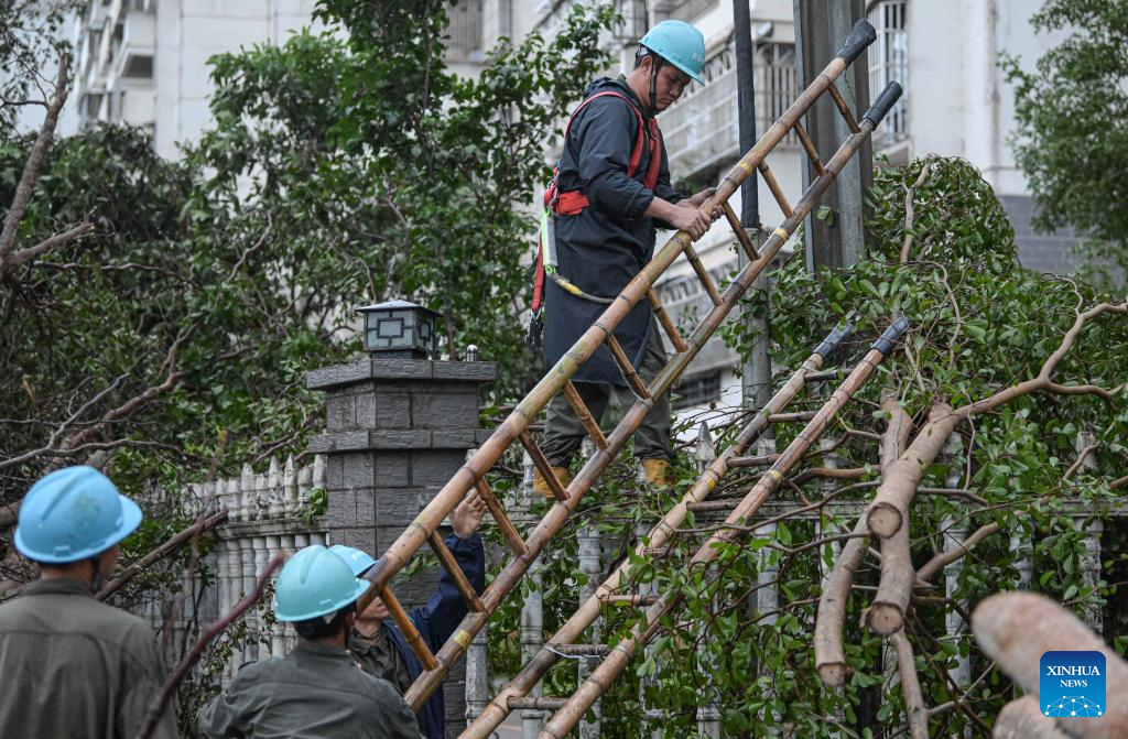 Staff members from a power company based in south China's Guangdong Province repair electrical facilities in Chengmai County, south China's Hainan Province, Sept. 9, 2024. Emergency response workers are busy fixing power supply facilities in Chengmai after Super Typhoon Yagi, the strongest autumn typhoon to land in China since 1949, hit Hainan on Friday. (Xinhua/Pu Xiaoxu)