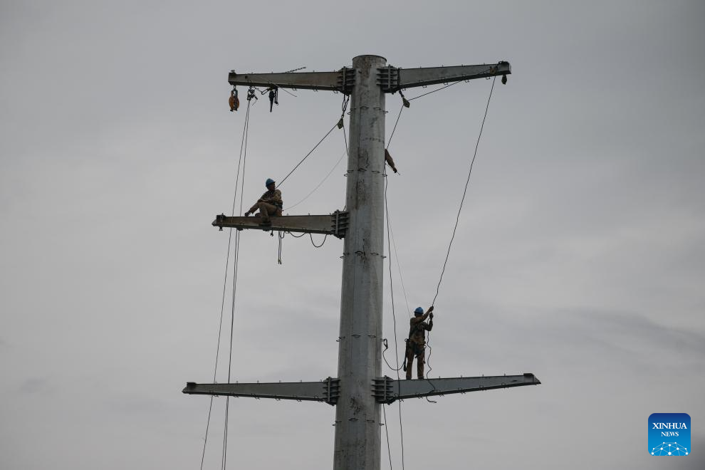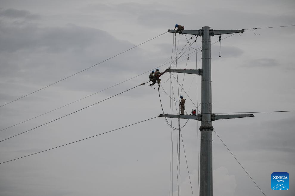 Staff members from a power company based in south China's Guangdong Province work in Chengmai County, south China's Hainan Province, Sept. 9, 2024. Emergency response workers are busy fixing power supply facilities in Chengmai after Super Typhoon Yagi, the strongest autumn typhoon to land in China since 1949, hit Hainan on Friday. (Xinhua/Pu Xiaoxu)