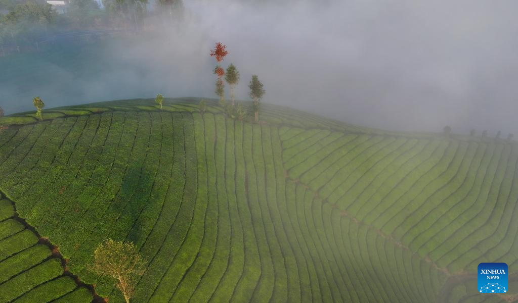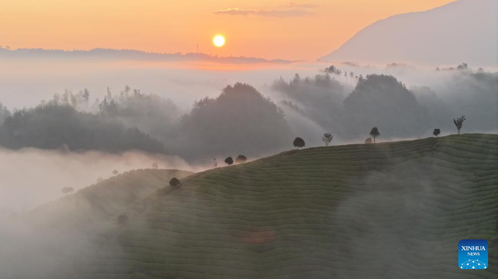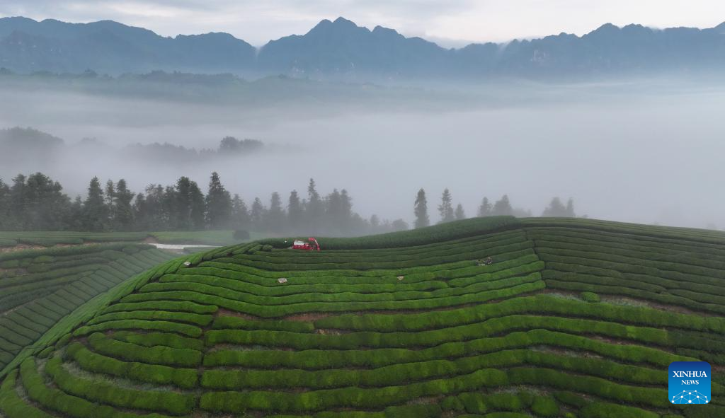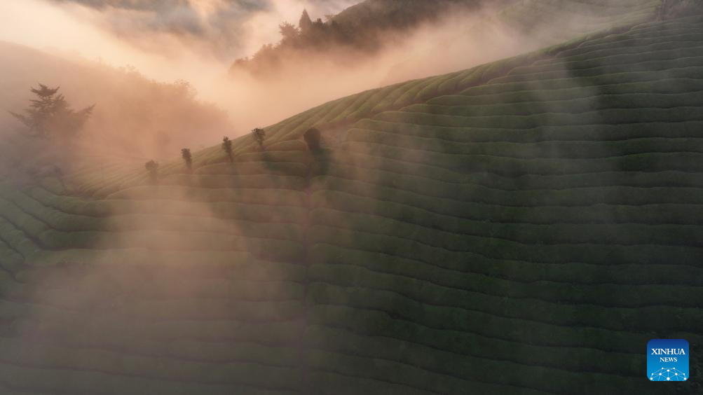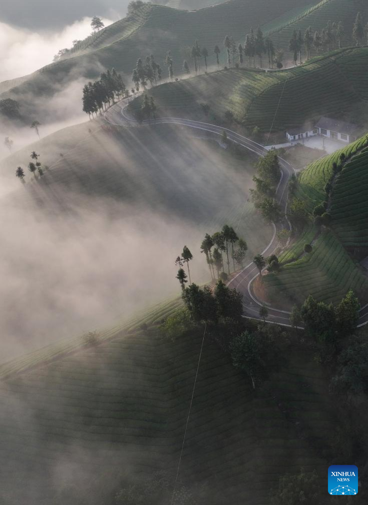Scenery of tea garden in Mu'er Mountain, C China's Hubei