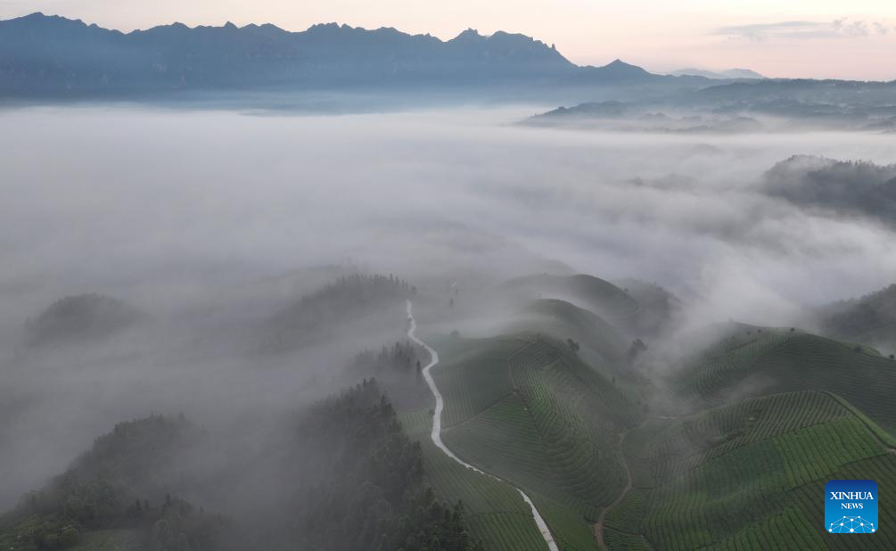 An aerial drone photo shows a tea garden in Mu'er Mountain in Zouma Town of Hefeng County, central China's Hubei Province, Sept. 9, 2024. (Photo by Yang Shunpi/Xinhua)