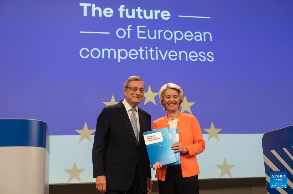 European Commission President Ursula von der Leyen attends a press conference on the report of the future of European competitiveness in Brussels, Belgium, on Sept. 9, 2024. Mario Draghi, former Italian prime minister and former governor of the European Central Bank, on Monday released a long-awaited report with his recommendations on how to improve the economic competitiveness of the European Union (EU). (European Union/Handout via Xinhua)