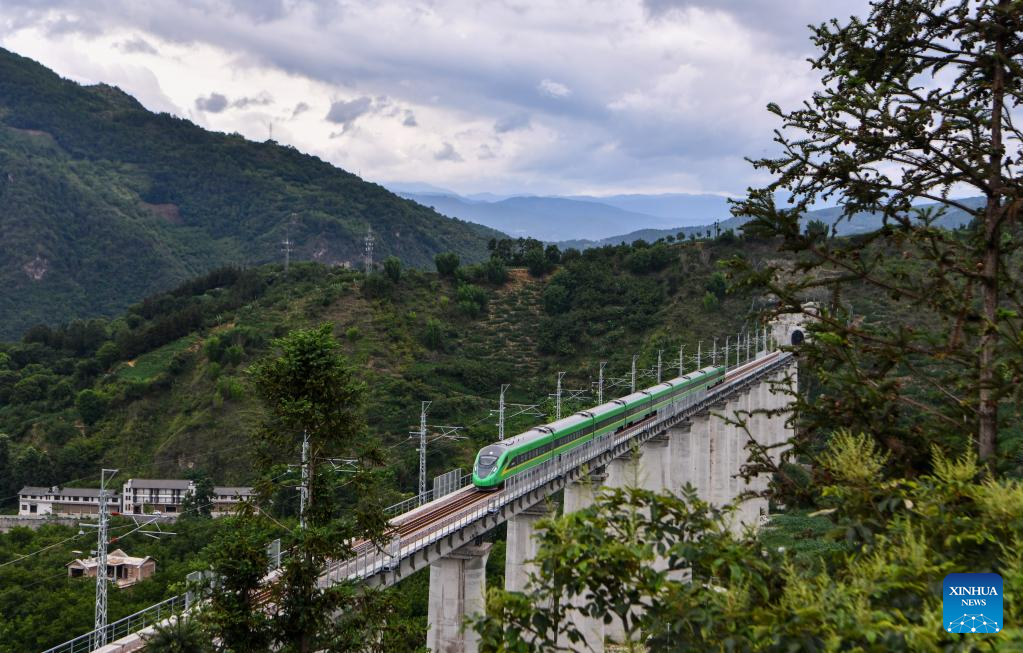 A bullet train stops at the Yongping County Railway Station along the Dali-Baoshan section of Dali-Ruili Railway in southwest China's Yunnan Province, July 19, 2022.